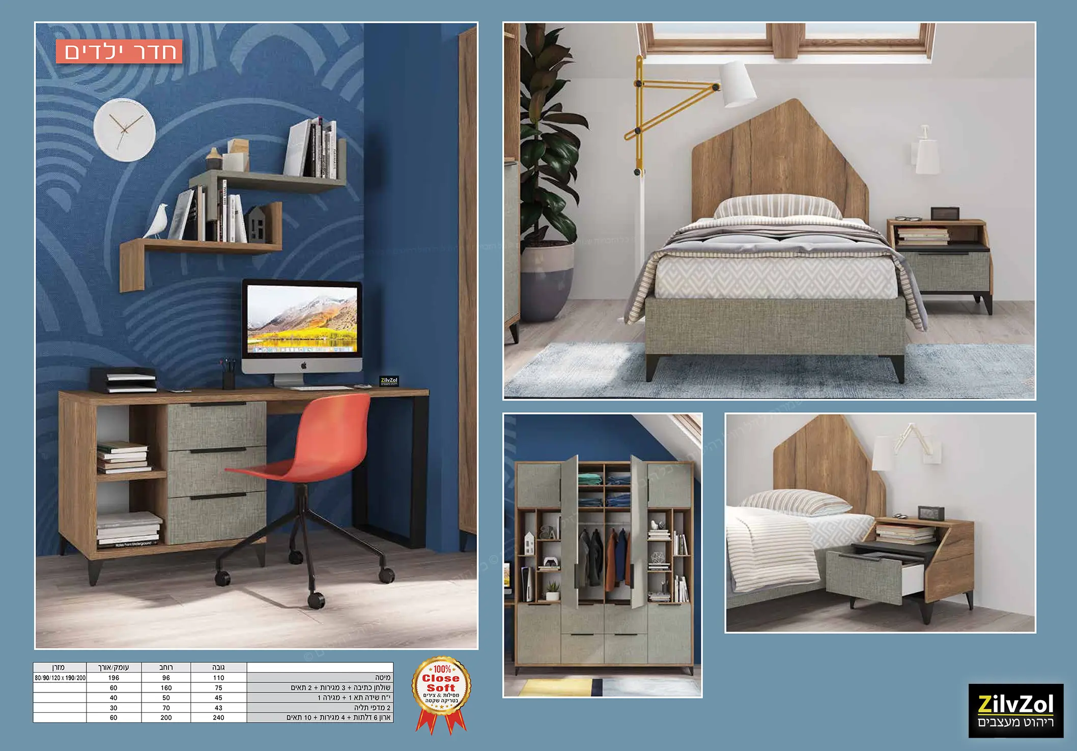 מידות לחדר ילדים ונוער דגם מורנו :